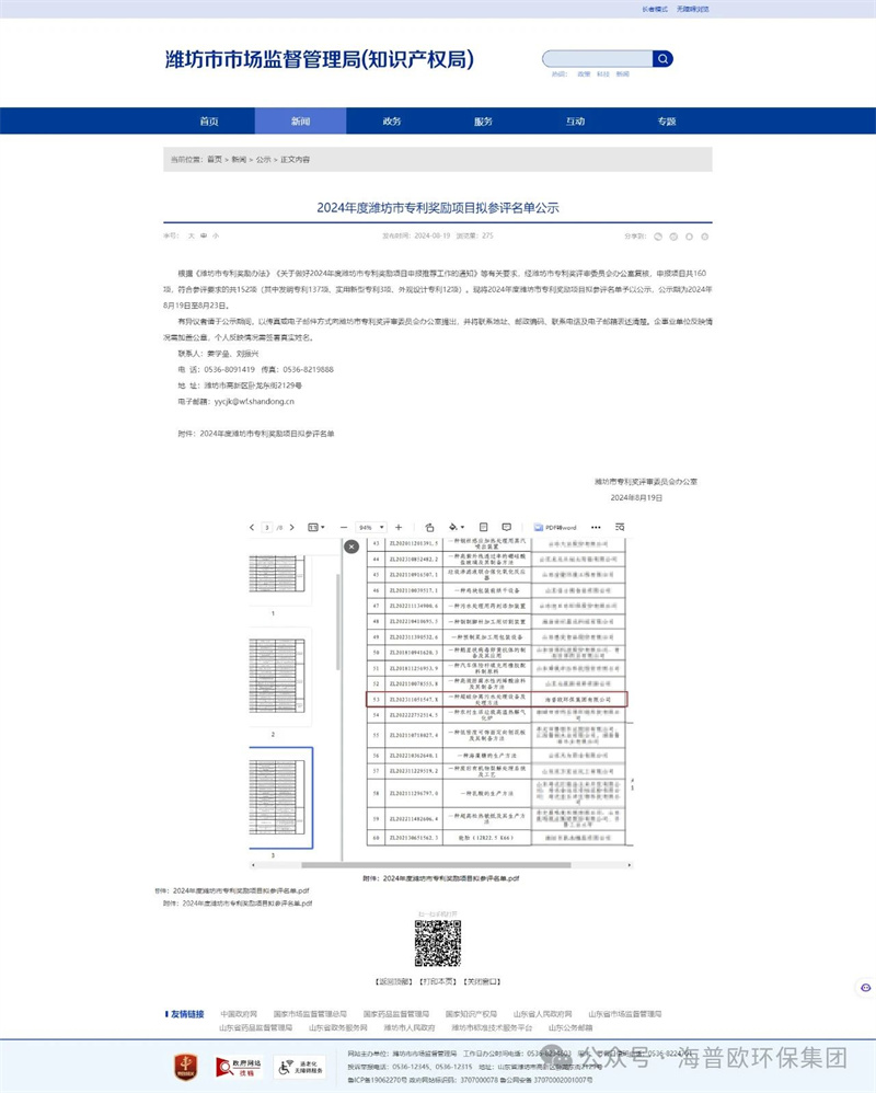 今日,濰坊市市場監(jiān)督管理局(知識產(chǎn)權(quán)局)一則振奮人心的喜訊傳來!海普歐環(huán)保集團的 “一種超磁分離污水處理設(shè)備及處理方法” 專利成功獲得 2024 年度濰坊市專利獎勵。